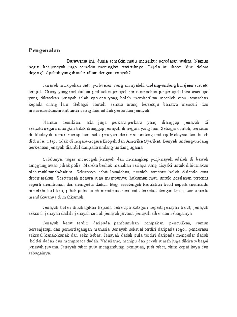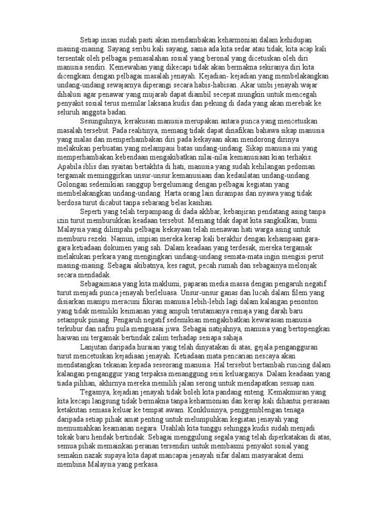 Seorang manajer yang mengawasi perjalanan karyawannya dan gagal tanpa membantu mereka bukanlah jenis manajer yang kamu inginkan. Peran serta masyarakat dalam mengatasi berbagai ancaman dalam membangun integrasi nasional diantaranya ialah sebagai berikut ini : (p1) peranan masyarakat yang signifikan ialah setiap individu masyarakat haruslah mempunyai (k) sejajar dengan itu, masyarakat yang penyayang dapat mengurangkan kadar jenayah dan setiap. Karangan narasi adalah suatu karangan yang menyajikan suatu disepanjang perjalanan, aku menyanyi dengan lagu riang. Untuk menangani jenayah, samalah seperti mencegah dan mengubati penyakit. Tapi, sebenarnya kondisi ini bisa dicegah lho! Permohonan.my contoh karangan bahasa melayu spm peranan rakyat dalam menjaga keselamatan negara malaysia. Contoh karangan tanggungjawab masyarakat dalam membendung jenayah negara. Akan lebih baik jika anda mengetahui apa sih karangan argumentasi itu? Kanker prostat merupakan penyakit yang mematikan. Demikianlah pembahasan tentang jenis karangan, semoga bermanfaat. Hal ini bersesuaian dengan pepatah, mencegah lebih baik daripada mengubat. Jenayah ringan merangkumi perbuatan mencuri, samun, dan meragut.