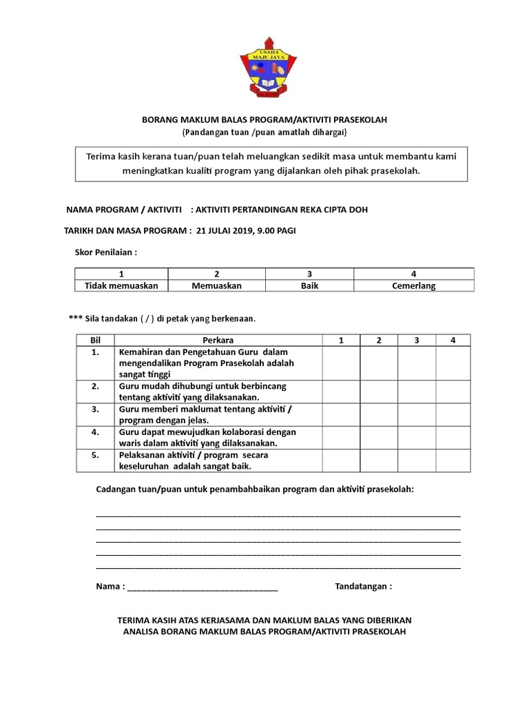 Contoh program kerja himpunanfull description. Panduan laporan maklum balas pemerhatian audit. .soal selidik program, contoh borang permohonan kerja, contoh borang tuntutan perjalanan, contoh borang soal selidik, contoh borang keberhasilan guru, contoh borang penilaian prestasi pekerja, contoh borang maklum balas, contoh borang pendaftaran, contoh borang. Sebagai penutup, sila isi borang maklum balas ini. Pusat pengurusan penyelidikan & instrumentasi.
