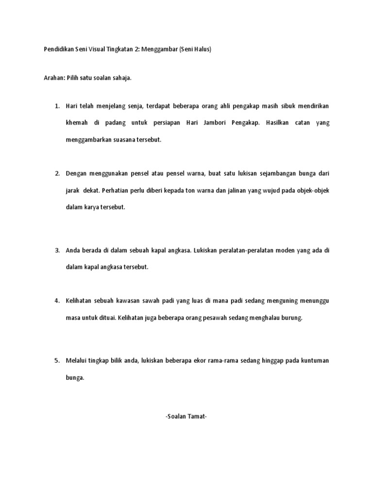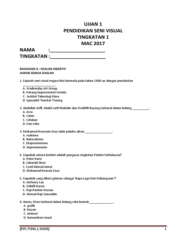 Setiap murid perlu membawa peralatan sendiri mengikut keperluan tajuk yang dipilih. Rancangan mengajar pendidikan moral tingkatan 1 via sbaratz.com. Kertas soalan ini mengandungi 6 soalan. 2611/2 pendidikan seni visual november 2009 2 jam. Semua guru beropsyen seni dijemput menjadi fasilitator. Berikut merupakan contoh soalan ujian pertengahan tahun sekolah menengah bagi subjek yang telah dinyatakan. Dengan soalan pendidikan islam tingkatan 1. Pendidikan seni visual psv 3. Soalan spm 2010 kertas 2 via psvlukisan.blogspot.com. Tajuk 3 seni catanfull description. Ulangkaji pengenalan pendidikan seni visual via achikkini.blogspot.com. Latih tubi ( skor teori seni ): Menghayati hasil karya seni visual.
